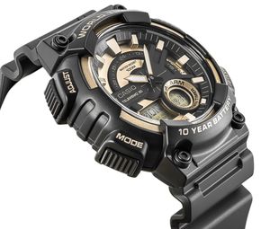 Zegarek Męski CASIO AEQ-110BW-9AVDFModel Casio AEQ-110W z wyrazistą metaliczną tarczą 3D i elementami w kolorze złotym sprawdza się zarówno w codziennym biegu po mieście, jak i w terenie – podczas wypadu za miasto czy weekendowego survivalu. Ten model nie potrzebuje taryfy ulgowej – został stworzony dla tych, którzy oczekują, że sprzęt będzie działać zawsze i wszędzie. 10 lat spokoju na jednej baterii, wodoszczelność 100 metrów (10 BAR), a do tego funkcje, które naprawdę się przydają: czas światowy w 30 miastach (29 stref czasowych), stoper 1/100 sekundy do zadań specjalnych, 3 alarmy dzienne, żeby nic Ci nie umknęło, i Telememo 30 – byś miał ważne kontakty pod ręką, nawet bez dostępu do telefonu. To zegarek, który nie tylko wygląda konkretnie – on po prostu jest konkretny. Opis produktu:Marka: CASIOSymbol: AEQ-110BW-9AVDFMechanizm: Kwarcowy zasilany baterią, ze wskazówką godzinową i minutowąTarcza: Analogowo - Cyfrowa 3DKoperta: Materiał żywiczny ResinSzkiełko: Żywiczne szkiełko Resin GlassPasek: Materiał żywiczny ResinStandardowe funkcje (cyfrowa tarcza): godzina, minuta, sekunda, AM/PM, miesiąc, data, dzień tygodniaDodatkowe funkcje: Aktualny czas w 30 miastach (29 stref czasowych) / Format 12/24 / Stoper 1/100 sekundy / Sygnał godzinowy / automatyczny kalendarz / Timer z funkcją odliczania/ / 3 alarmy (1 z funkcją drzemki) / Sygnał pełnej godziny / TELEMEMO (pamięć 30 wpisów)Podświetlenie: powłoka świetlna Neobrite na wskazówkachWodoszczelność: 10 BAR - odporny na kontakt z wodą / pływanieAntyalergiczny: Tak - nie zawiera nikluBateria: 10-letnia żywotność baterii (10 Year Battery) Wymiary w mm:Koperta: 52 mm x 48 mmGrubość: 14,2 mmPasek szerokość: 28/20 mmObwód: max 230 mm Kolorystyka:Koperta / Pasek: czarnyTarcza 3D: czarna + złote elementyWskazówki: powłoka Neobrite 10-letnia żywotność baterii – niezawodność i wygoda z CasioZegarki Casio wyposażone w baterię CR2025 zapewniają aż 10 lat nieprzerwanej pracy, eliminując konieczność częstej wymiany baterii. To idealne rozwiązanie dla osób ceniących sobie niezawodność, oszczędność i wygodę w codziennym użytkowaniu.Dzięki długiej żywotności baterii możesz cieszyć się swoim zegarkiem bez obaw o jego działanie, niezależnie od warunków. Casio łączy trwałość, funkcjonalność i klasyczny styl, oferując zegarki, które sprostają wymaganiom nowoczesnego użytkownika. MECHANIZM KWARCOWY - dokładność i niezawodnośćJest to niezawodny mechanizm stosowany w klasycznych zegarkach cyfrowych Casio, który łączy funkcjonalność z długą żywotnością baterii. Wymiana baterii to jedyna regularna czynność, którą należy wykonywać podczas użytkowania kwarcowego zegarka. To idealny wybór dla aktywnych osób, które cenią sobie komfort i prostotę w działaniu zegarka. TARCZA 3D - DYNAMIKA W DZIAŁANIUWystające, przestrzenne indeksy w intensywnym w kolorze nie tylko świetnie kontrastują z matową czernią, ale przede wszystkim dodają tarczy głębi i charakteru. Każdy detal, od wyraźnie zarysowanych wskazówek po strukturę pierścienia, podkreśla dynamiczny i nowoczesny styl zegarka, który łączy czytelność z surowym, outdoorowym pazurem.SZKIEŁKO RESINOWE - OPTYMALNA OCHRONA ORAZ CZYTELNA TARCZAWykonane z wyjątkowo lekkiego i wytrzymałego materiały żywicznego, który dzięki elastyczności lepiej radzi sobie z wstrząsami i upadkami w porównaniu do tradycyjnego szkła. Dodatkowo zapewnia doskonałą przejrzystość oraz jasność, co znacząco ułatwia szybki i wyraźny odczyt godziny w różnych warunkach oświetleniowych. PRZYDATNE FUNKCJECzas światowy w 30 miastach pozwala łatwo odnaleźć się w różnych strefach czasowych – niezależnie od tego, gdzie jesteś lub dokąd zmierzasz. Stoper z dokładnością do 1/100 sekundy i funkcja timera sprawdzą się zarówno podczas intensywnego treningu, jak i w zabieganym dniu. Sygnał pełnej godziny przypomina o upływającym czasie, a w pełni automatyczny kalendarz zadba o aktualną datę aż do 2099 roku – bez Twojej ingerencji. TELEMEMO 30 – TWÓJ CYFROWY NOTATNIKZ funkcją Telememo 30 masz swoje kontakty zawsze tam, gdzie trzeba – na nadgarstku. Pojemność do 30 zestawów danych, każdy z 8-znakową nazwą i 16-cyfrowym numerem telefonu, sprawia, że najważniejsze informacje masz pod ręką, nawet gdy telefon zawiedzie lub jesteś poza zasięgiem. Dodatkowo: ekran z ilością dostępnej pamięci, automatyczne sortowanie danych. WIELOFUNKCYJNY ALARM Z funkcją drzemki Trzy niezależne alarmy dzienne, w tym jeden z funkcją drzemki, pomagają utrzymać rytm dnia – przypominając o ważnych zadaniach, treningach czy spotkaniach. Funkcja drzemki daje Ci kilka minut więcej, gdy naprawdę ich potrzebujesz – idealna na poranki i krótkie resetujące przerwy w ciągu dnia. WODOODPORNOŚĆ 10 BAR - NIEZAWODNOŚĆ W EKSTREMALNYCH WARUNKACHZegarek z łatwością radzi sobie z przypadkowymi zachlapaniami, deszczem, a nawet kontaktami z wodą podczas aktywności, takich jak pływanie czy rekreacyjne sporty wodne. Solidna konstrukcja zapewnia trwałość w miejskiej dżungli i podczas outdoorowych przygód. PASEK RESINOWY (Materiał żywiczny)Bardzo lekki, zapewniając komfort w codziennym użytkowaniu, zwłaszcza w przypadku aktywności fizycznej. Materiał żywiczny jest odporny na uszkodzenia mechaniczne, takie jak pęknięcia czy złamania, co czyni go idealnym wyborem do zegarków przeznaczonych do intensywnego użytkowania. Resin jest odporny na wilgoć, działanie wody, a także na zmiany temperatury, co sprawia, że paski te doskonale sprawdzają się w trudnych warunkach. Paski resinowe są łatwe do czyszczenia - wystarczy przetrzeć je wilgotną ściereczką, aby usunąć zabrudzenia. ZESTAW ZAWIERA:Oryginalny zegarek marki CASIOFirmowe pudełko CASIO Kartę gwarancyjną z instrukcją obsługi ZEGAREK CASIO - CZAS W NAJLEPSZYM WYD